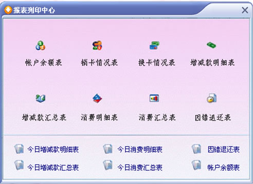 对于帐户余额信息、销卡/换卡信息、增减款明细及汇总、消费明细、消费汇总统计等以报表显示,另支持Excel格式导出,打印