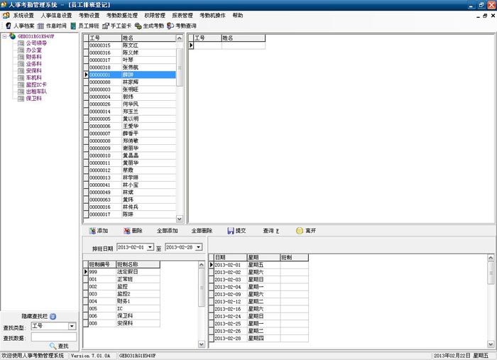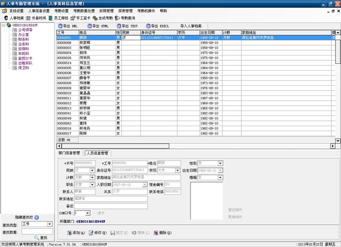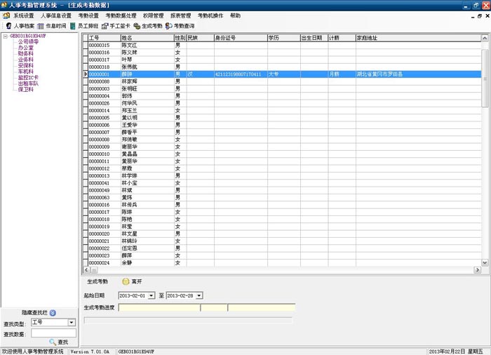 工号、姓名、部门、性别、证件号码、出生日期等个人资料,办理工卡或登记录入指纹,建立完善的人事档案