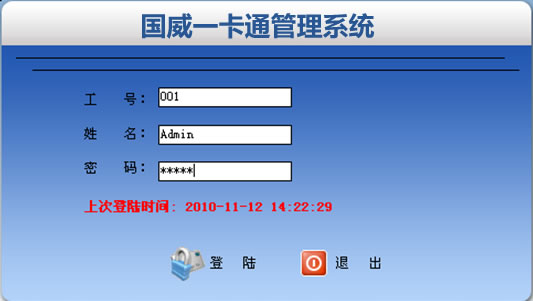 首次登陆工号输入“001”回车,姓名栏会显示“admin”密码“admin”下面会显示该用户上次登陆时间点击登陆。