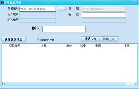 点击【新增】按钮,点击【选择就医项目】,刷卡输入犯人卡号,点击确认,即可完成就医下账操作。