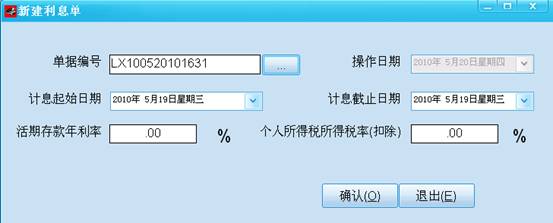 2) 点击【新增单据】,新增一个利息计算单。包含:单据编号,利息计算起始日期,截止日期,银行活期利率,个人所得税率。