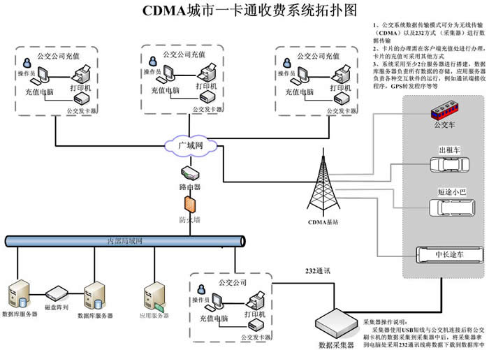 城市公交一卡通管理系统采用CDMA实现数据的无线传输及数据交互,硬件默认支持100万张发卡量(可扩展)。软件端可采用广域网进行多个(不限制)充值点连接充值等,默认各种报表均有由程序及结算中心自动结算完成。